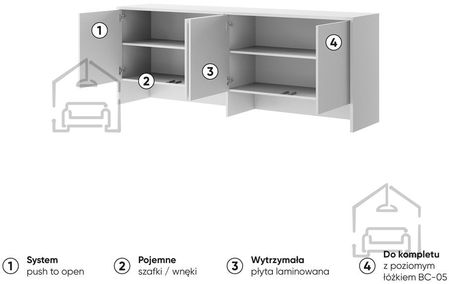 Funkcionalni podaljšek z dvema omaricama ter eno polico v vsaki za kombiniranje z omarno posteljo BC-05. V prostornih omaricah lahko shranite veliko stvari. Nadstavek bo ustvaril zanimiv, sodoben izgled ter prihranil prostor v vaši sobi. Pohištvo je izdelano iz trpežne laminirane plošče z ABS robom.