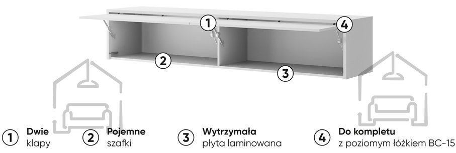 Funkcionalni podaljšek z dvema omaricama za kombiniranje z omarno posteljo BC-14. V prostornih omaricah lahko shranite veliko stvari. Nadstavek bo ustvaril zanimiv, sodoben izgled ter prihranil prostor v vaši sobi. Pohištvo je izdelano iz trpežne laminirane plošče z ABS robom.