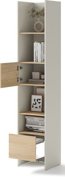 Knjižne omare so odličen način za shranjevanje knjig, pripomočkov, spominkov in drugih manjših predmetov v skoraj vsakem prostoru. Ne le olajšajo vzdrževanje reda, ampak tudi naredijo notranjost bolj prijetno in osebno na zanimiv način. Knjižna omara BC-23 z omaro, predalom in policami je dizajnerski predlog za ljudi, ki imajo radi neočitne kombinacije odprtega in zaprtega prostora.
