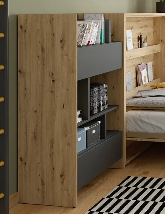 BC-25 je odlična ponudba za lastnike BED CONCEPT polposteljne ležeče lege za vzmetnico širine 90 cm. Tako sestavljena garnitura nam ne daje le dodatnega prostora za shranjevanje, temveč vnaša tudi lahkotnost in prijetno vzdušje. Knjižna omara je sestavljena iz več polic, ki vam omogočajo priročno shranjevanje vaših najljubših knjig, okraskov in drugih drobnarij. Prekati so med seboj različno oddaljeni, kar omogoča odlaganje tako velikih kot manjših predmetov.
