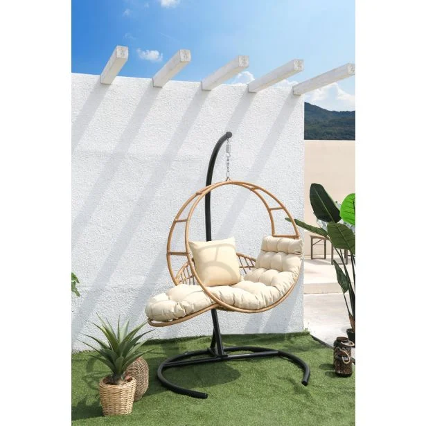 Viseči vrtni fotelj Monako ima stabilen jekleni okvir, zaradi katerega se kokon stola ne deformira. Struktura podlage je krožna, kar dodatno vpliva na stabilnost. Za izdelavo vrtnega stola je bil uporabljen ravno tehno ratan. Kokon visečega stola ima trdno pritrditev, kar zagotavlja njegovo vzdržljivost in daljšo uporabo. Viseči fotelj iz ratana se zaradi preprostega videza estetsko prilega vsakemu okolju, hkrati pa daje široke možnosti postavitve. Celoletni gugalni stol bo popoln tako kot fotelj za sobo, kot tudi kot gugalnica za teraso ali gugalnica za balkon. Bež viseči fotelj z okvirjem vam daje možnost počitka ob nežnem zibanju.