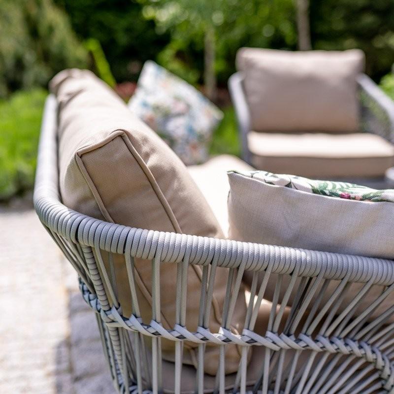 Elegantna vrtna garnitura za 5 oseb, ki jo odlikuje eleganten dizajn. Komplet vsebuje velik kavč 3-sed, 2 fotelja in mizo. Jekleno ogrodje pohištva zagotavlja stabilnost konstrukcije in preprečuje deformacije. Sedeži so izdelani iz ravnega ratana v kombinaciji z vrvjo iz poli ratana. Material z večjo odpornostjo na vremenske vplive bo poskrbel za daljšo življenjsko dobo pohištva. Mehke blazine na sedežih in naslonjalih imajo prevleke iz poliestra z zadrgo, zaradi česar jih je enostavno čistiti.