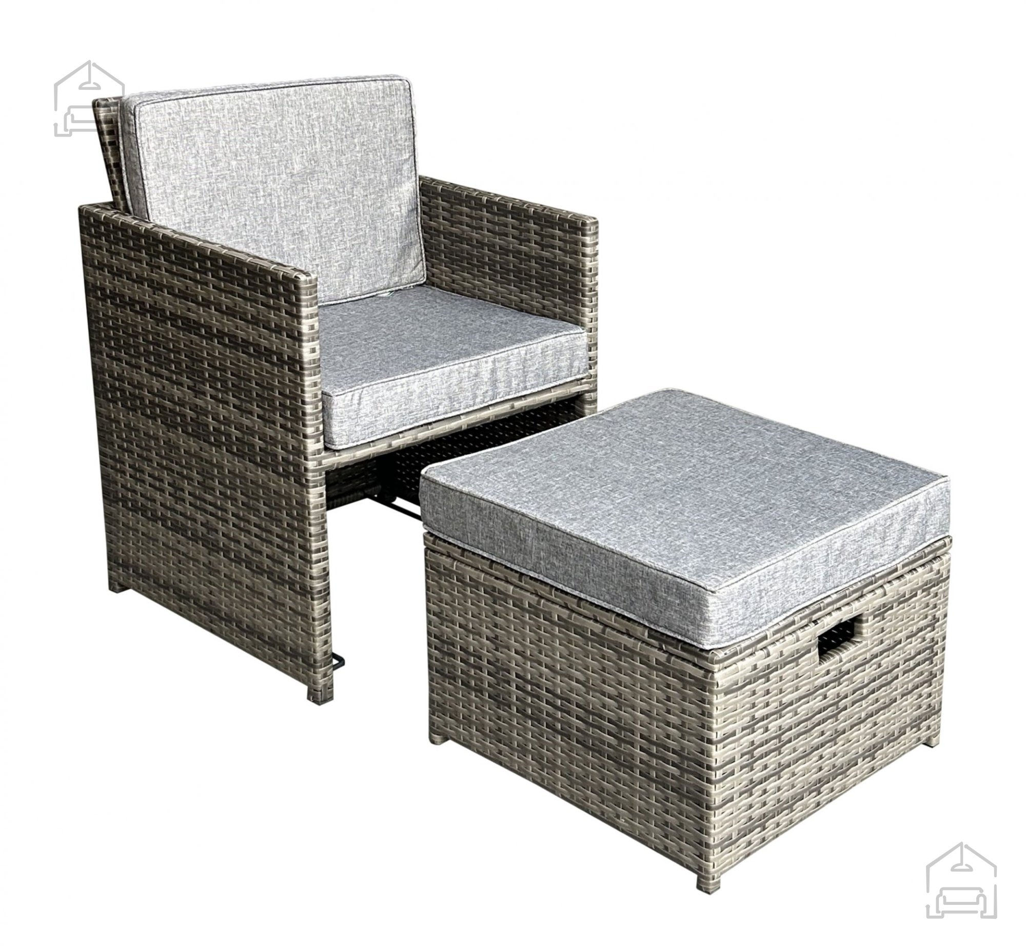 | Content | V kompletu: 4x fotelj, 4x tabure, 1x mizica