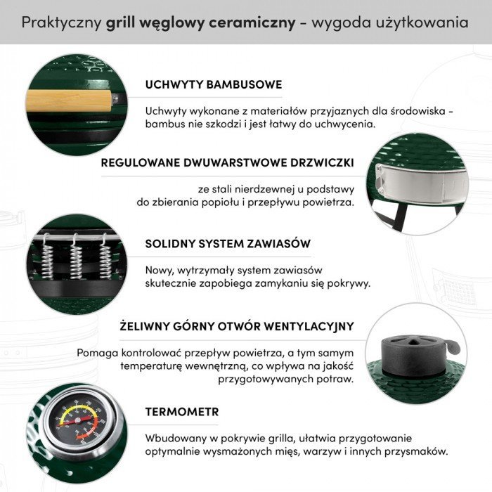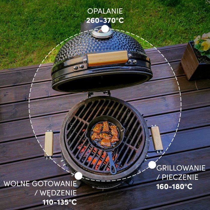 Dimenzije: 550x550x550 mm Sodoben keramični žar na oglje, ki ne združuje le odličnih parametrov pečenja, temveč tudi estetiko in funkcionalnost. Zaradi elegantnega videza in trdne konstrukcije bo neločljiv element terase. Žar ima glavni del z impresivnim premerom 32 cm, ki zagotavlja dovolj prostora za pripravo okusnih jedi. Rešetka za kuhanje s premerom 26,5 cm zagotavlja natančno in enakomerno pečenje ne glede na vrsto hrane. Izdelan je iz emajliranega porcelana in ne le olajša vzdrževanje čistega, ampak tudi odlično prevaja toploto, kar pomeni enakomerno pečenje hrane. Kamin je izdelan iz materiala Mulite in je odporen na temperature do 1000 stopinj, kar zagotavlja vzdržljivost in varnost med uporabo.