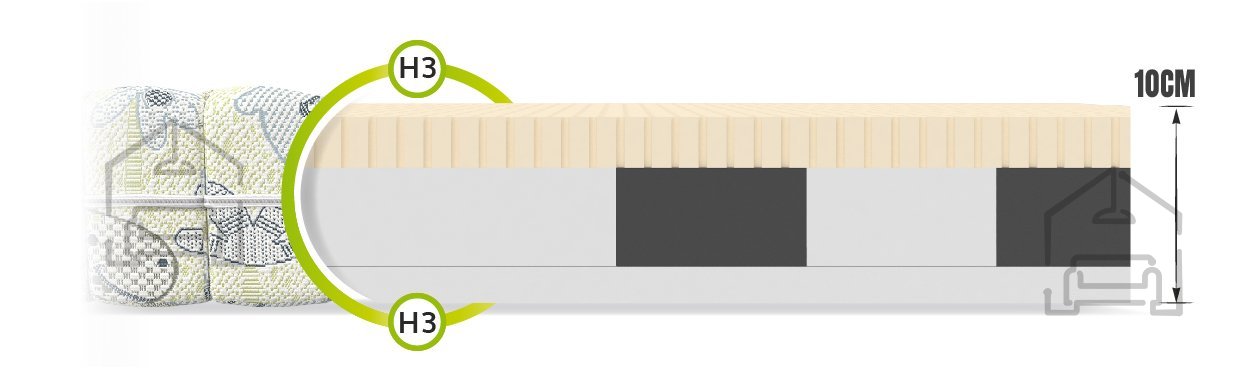 VISOKO ELASTIČNA PENA HR H30 Izdelana iz milijonov mehurčkov zagotavlja popolno prileganje vzmetnice obliki telesa, hkrati pa ostaja izjemno lahka. Zanj je značilna povečana fleksibilnost, kar bistveno poveča udobje uporabe in podaljša življenjsko dobo vzmetnice. Ta material odlikuje izjemna vzdržljivost in odpornost na deformacije. Dodatna prednost HR pene je njena porozna struktura, ki zagotavlja popolno kroženje zraka, kar preprečuje razvoj bakterij in plesni.